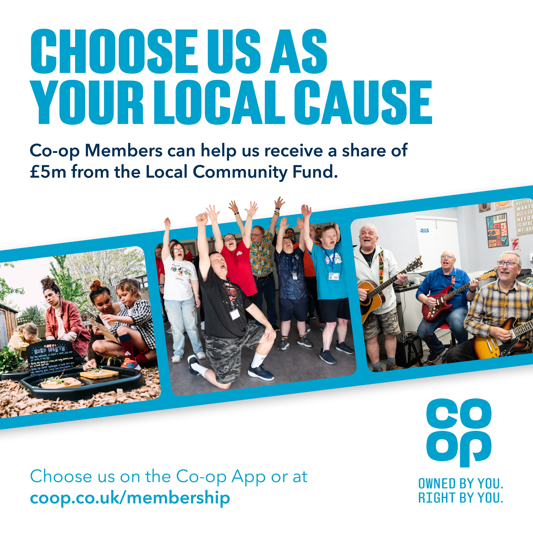 We are very pleased and grateful to be chosen by the Co-op Community Fund as a charity partner for 2025-26, and we would love as many of our supporters as possible to choose us as their cause so we can fit out and kit out our new community centre.